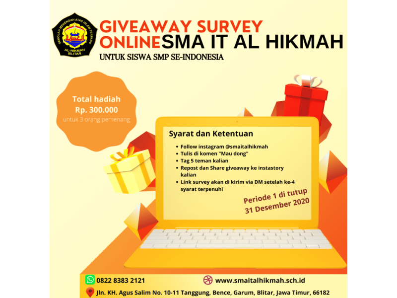Ayo ikuti survey online via instagram.Follow akun instagram @smaitalhikmah dan ikuti rules atau syarat ketentuannya.Segera ikuti dan menangkan hadiah nya. ...